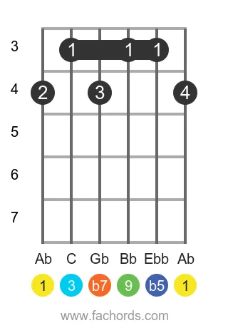 The Ab9b5 chord is a complex member of the Dominant Chords family, built from the notes Ab, C, Ebb, Gb, and Bb. These correspond to the intervals Root (1), Major Third (3), Diminished Fifth (b5), Minor Seventh (b7), and Major Ninth (9). Use the interactive fretboard tool at the top of this page to explore every fingering, listen to the chord played as a strum or arpeggio, and get instant feedback on your playing with the real-time microphone feature.