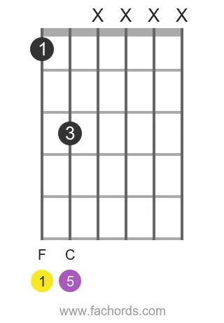The F5 chord is constructed from the notes F and C. In terms of musical intervals, F represents the Root (1), and C represents the Perfect Fifth (5) of the chord.