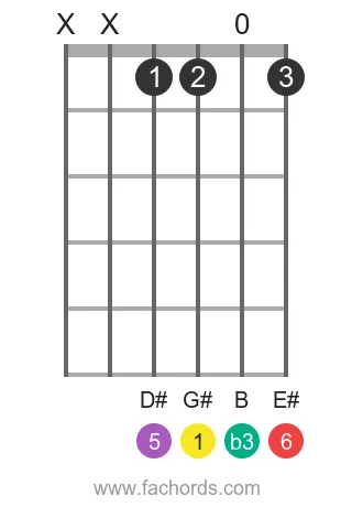 The G#m6 chord is a member of the Minor Chords family, built from the notes G#, B, D#, and E#. These correspond to the intervals Root (1), Minor Third (b3), Perfect Fifth (5), and Major Sixth (6). Use the interactive fretboard tool on this page to visualize every fingering, listen to the chord played as a strum or arpeggio, and get instant feedback on your playing with the real-time microphone feedback.